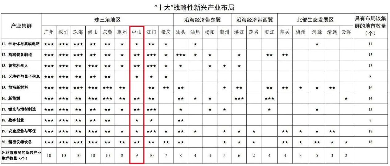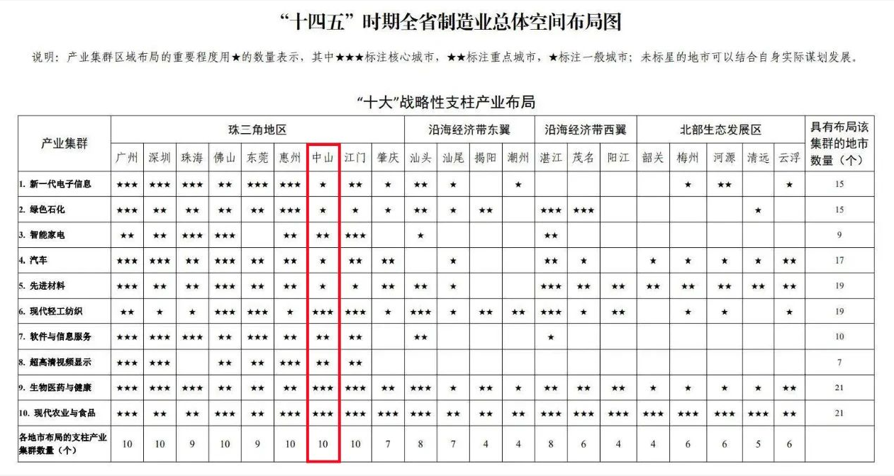 在“十大”戰(zhàn)略性支柱產(chǎn)業(yè)布局上,中山被列入全部產(chǎn)業(yè)布局范圍,是全省6個(gè)全部被列入的城市之一(分別為廣州、深圳、佛山、惠州、中山、江門(mén))。其中,現(xiàn)代輕工紡織、生物醫(yī)藥與健康、現(xiàn)代農(nóng)業(yè)與食品3個(gè)產(chǎn)業(yè)將中山作為核心布局城市,智能家電、軟件與信息服務(wù)、超高清視頻顯示3個(gè)產(chǎn)業(yè)將中山作為重點(diǎn)布局城市。